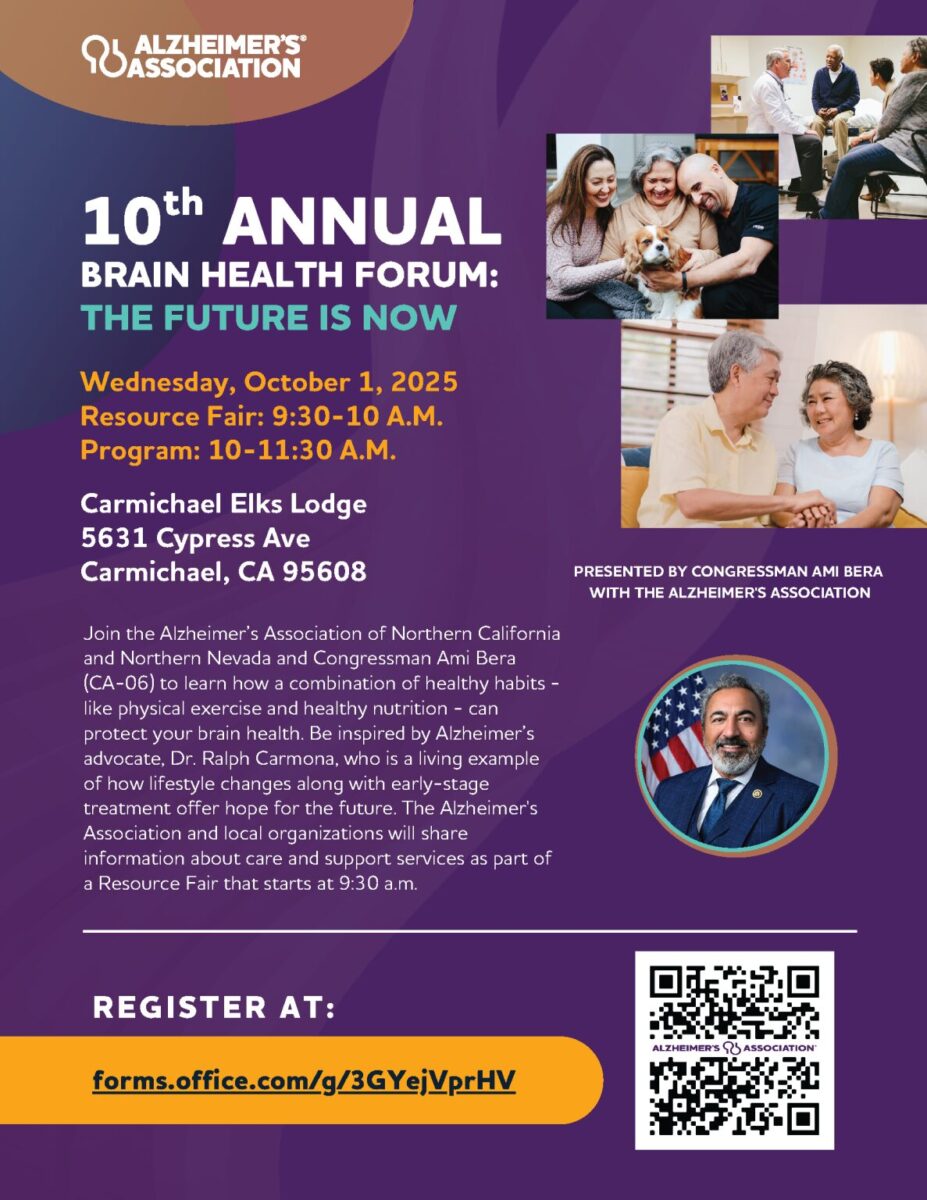 Join the Alzheimer’s Association of Northern California and Northern Nevada and Congressman Ami Bera (CA-06) for the 10th Annual Brain Health Forum — a free community event focused on protecting your brain through healthy habits, expert insights, and local support resources.