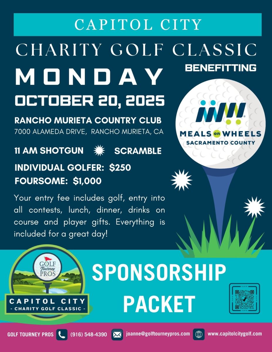 One of our signature events is the Capitol City Charity Golf Classic Benefitting Meals on Wheels Sacramento County. The tournament will be a scramble format, with registration and breakfast starting at 9:00 AM. The shotgun start will be at 11:00 AM, followed by lunch, awards, raffle & auction. Join us as a single player ($250 per player), foursome ($1,000 per foursome), or sponsor.