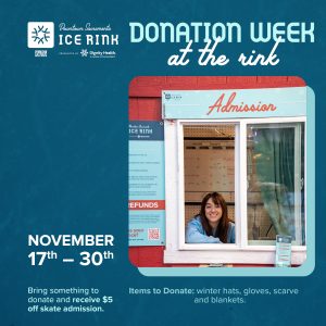 Give back while you glide! Bring winter essentials like hats, gloves, scarves, or blankets to support those experiencing homelessness in the Sacramento area and receive $5 off your skate admission as a thank-you for spreading holiday cheer.