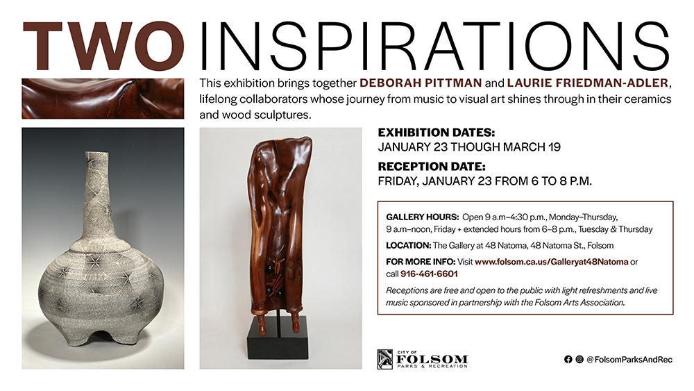 Join us for the opening reception on Friday, January 23, from 6–8 p.m., celebrating Two Inspirations, a compelling exhibition featuring the work of artists Deborah Pittman and Laurie Friedman-Adler. The reception is free and open to the public, with light refreshments and live music in partnership with the Folsom Arts Association.