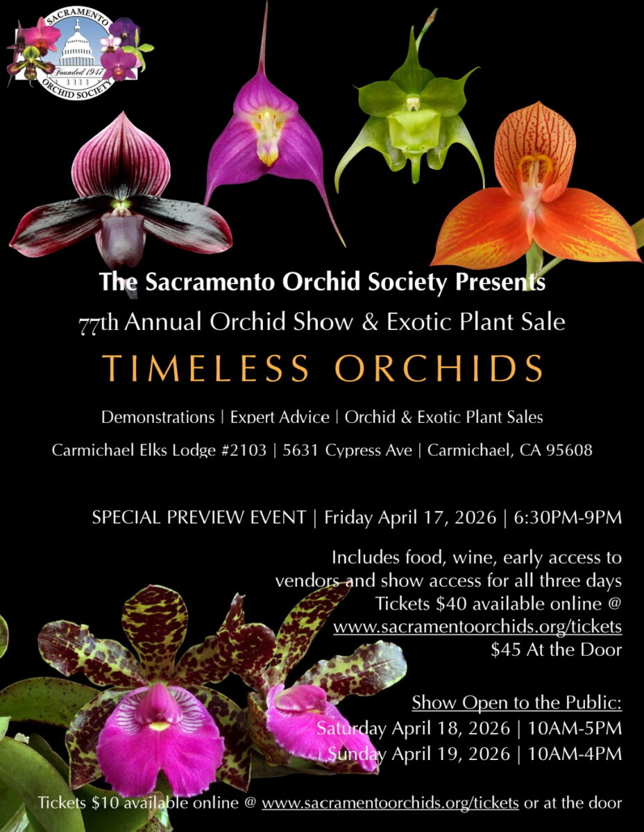 The Sacramento Orchid Society is excited to present their 77th Annual Orchid Show & Exotic Plant Sale on April 17th – 19th, 2026. The show will be held at the Carmichael Elks Lodge #2103, 5631 Cypress Avenue, Carmichael 95608. The show features a Preview Night on Friday, April 17th, from 6:30pm – 9pm which showcases food, wine and early access to displays, experts and vendors. Tickets for the preview night are $40 per person and include access to the show all weekend. The show opens to the public Saturday 10am – 5pm and Sunday 10am – 4pm. Presale tickets are available online or from society members for $10 or $13 ($12.50 for 2 or more) at the door and can be purchased at www.sacramentoorchids.org/tickets. Children under 16 are free when accompanied by a parent. There is plenty of free parking available at the event.